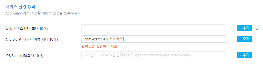 - 어플리케이션 이름과 네이버 지도 서비스를 체크합니다.
