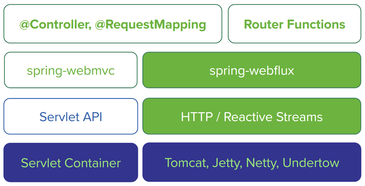 여러가지 특징 중 Tomcat과 같은 WAS에 의존적인 구조이고 Spring 3.1 스펙에서는 Non-Blocking I/O를 지원하지만 본질적으로 Blocking 이고 동기방식입니다. 따라서 전체 stack을 reactive하게 만들 순 없었습니다.