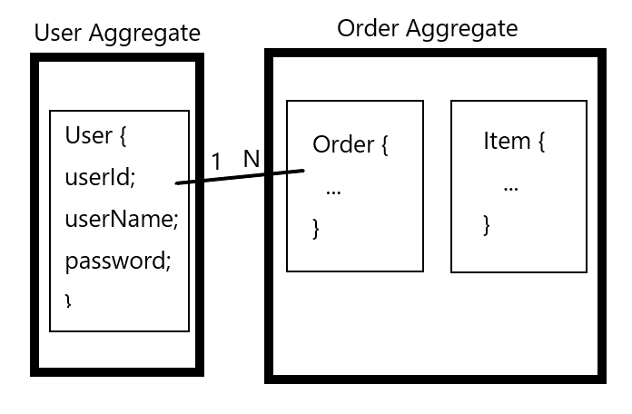 Aggregate는 즉, 그룹입니다. 위의 예시 모델들로 따지면 주문서와 주문된 Item은 Aggregate를 나눌 수도 있지만 Order Aggregate로 묶을 수도 있을 것 같습니다. 사용자는 따로 Aggregate를 구성해서 묶어야겠습니다.