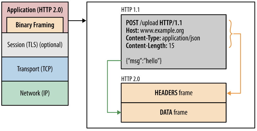 위의 그림에서 큰 특징 중 하나를 보면 HEADERS frame, DATA frame이 있습니다. 기존에는 Header와 Data를 구분하는 것은 개행밖에 없었지만 이제는 Frame으로 구분됩니다.