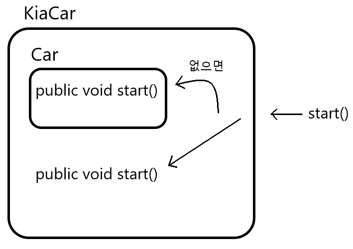 - KiaCar 객체의 start()를 찾고 없으면 부모 클래스의 start()를 호출